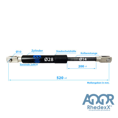 Gasdruckfeder Gabelkopf 520mm/200mm 1.300N-2.500N M10
