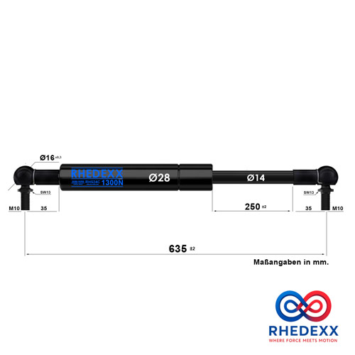 Gasdruckfeder Gasdruckdämpfer Kugelkopf 635mm/250mm 1.300N-2.100N M10